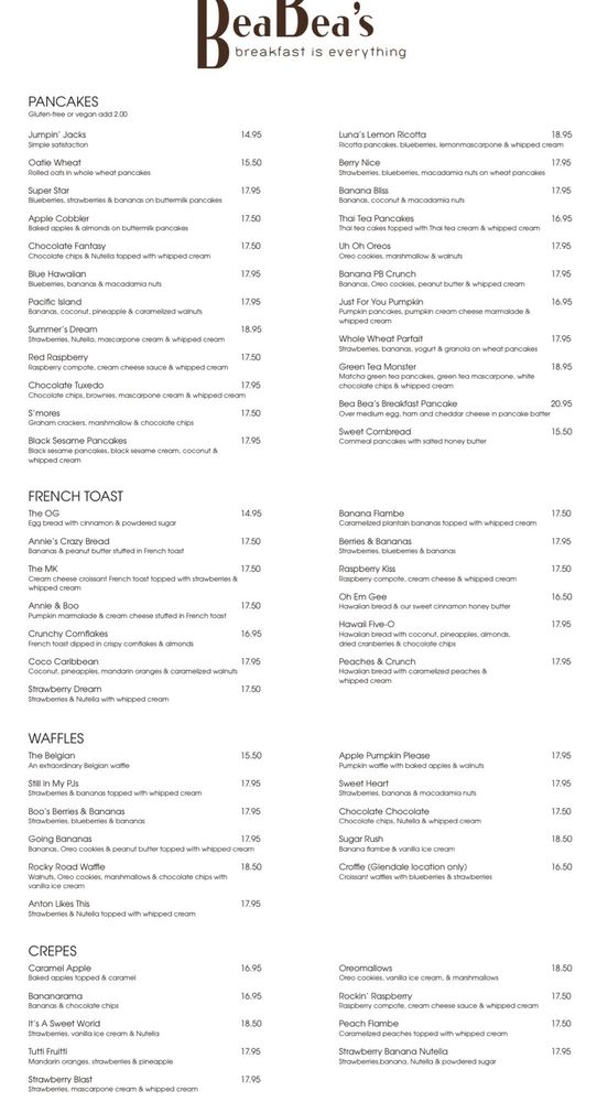 Discover the hidden gem of Burbank at Bea Bea's, a casual and welcoming spot offering a variety of breakfast and brunch options. With vegan and vegetarian choices, along with plenty of parking, Bea Bea's caters to all preferences. Customers rave about the light and flavorful lemon ricotta pancakes, the moist and decadent Thai tea pancakes, and the hearty crab benedict. The Pacific Island pancakes are a must-try for those craving a tropical twist. Despite the bustling atmosphere, the efficient service ensures a pleasant dining experience. Whether meeting friends for a catch-up or enjoying a family breakfast, Bea Bea's provides a satisfying meal in a relaxed setting. Don't miss out on the delicious dishes and friendly ambiance at Bea Bea's in Burbank.